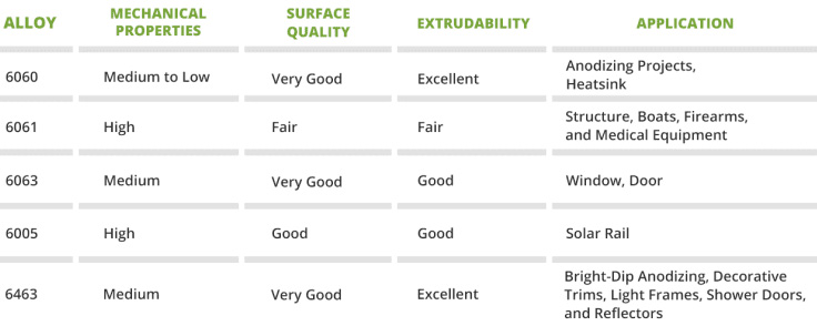 Alloy series are represented by 4 digits. The most commonly used series start with 2XXX includes copper, 4XXX includes silicon, and 6XXX includes magnesium and silicon. Besides having different material composition, they also have different characteristics. Mechanical properties include ductility, workability, corrosion resistance, tensile strength, weldability and density. When the mechanical properties increase, the ability to extrude and surface appearance quality decreases.