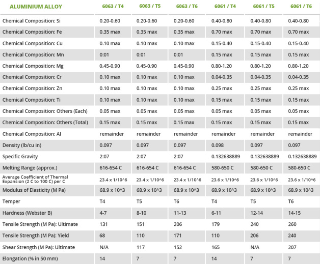 Application: Tubing for Furniture, Ladders, Railway and Bus Profile Structures, Solar Panel Mounting, Pylons, Platforms and Pipelines, Products where greater strength is needed than given by 6060 and 6063.